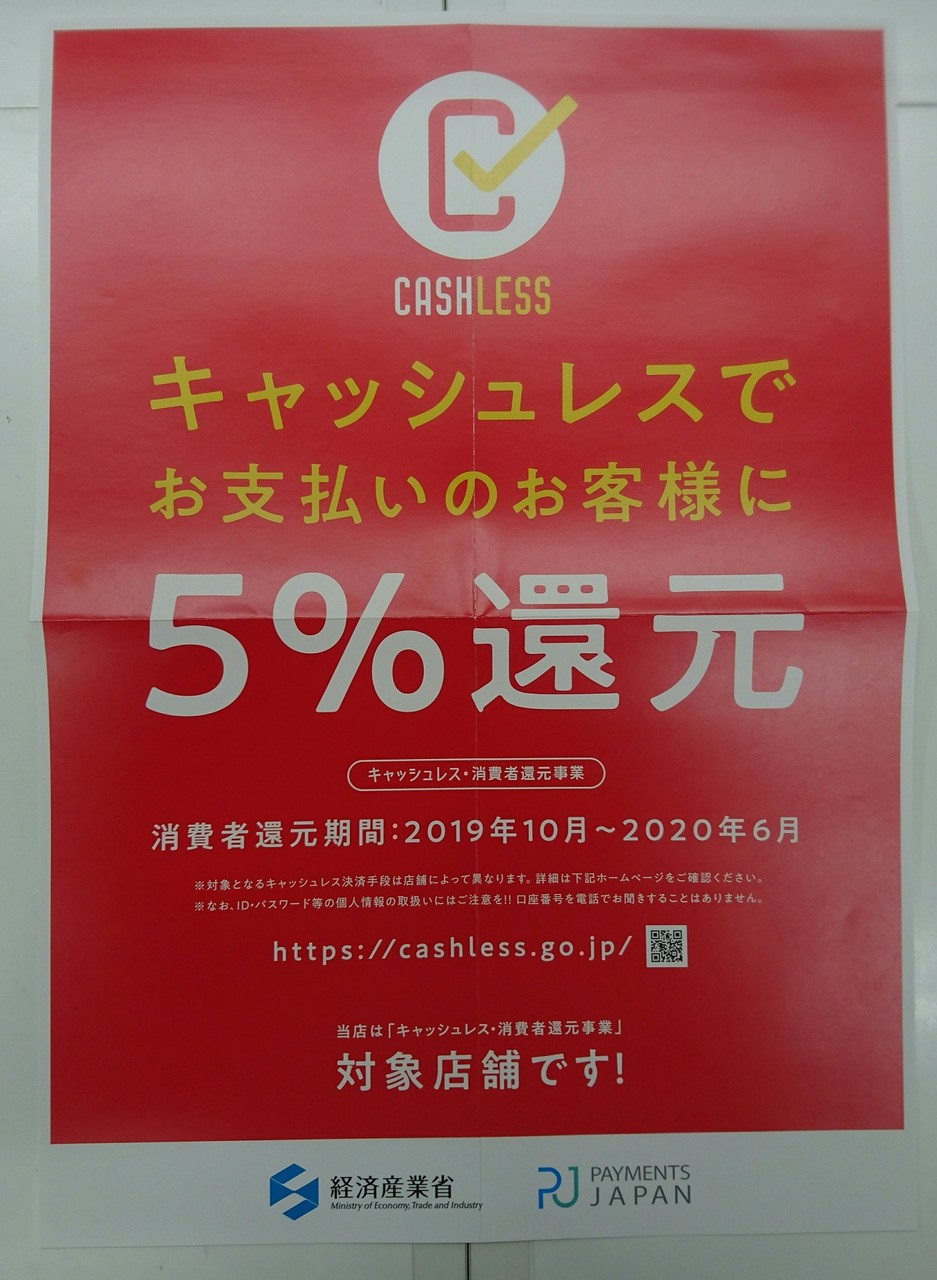食品全般と定期購読の新聞などには『軽減税率』が採用されています。当店は衣料品店ですのでほぼ10%ですが、取り扱いのギフト商品には「食品ギフト」があり、8%の税率で計算しています。もちろんレジも対応機種に1年ほど前に替えました。キャッシュレス対応も「楽天ペイ」をメインに端末も入れ、対応を済ませています。遅ればせながら『キャッシュレス・消費者還元事業』の「対象店舗」にも10月21日より正式に登録になっています。当店は言わずとも小規模小売店ですからキャッシュレスでのお支払いで5%分ポイント還元です。それに対象者は限定的ですが『プレミアム商品券』も販売されていて、市内でもプレミアム商品券取扱店ののぼり旗が立てられています。もちろん当店にもあります。